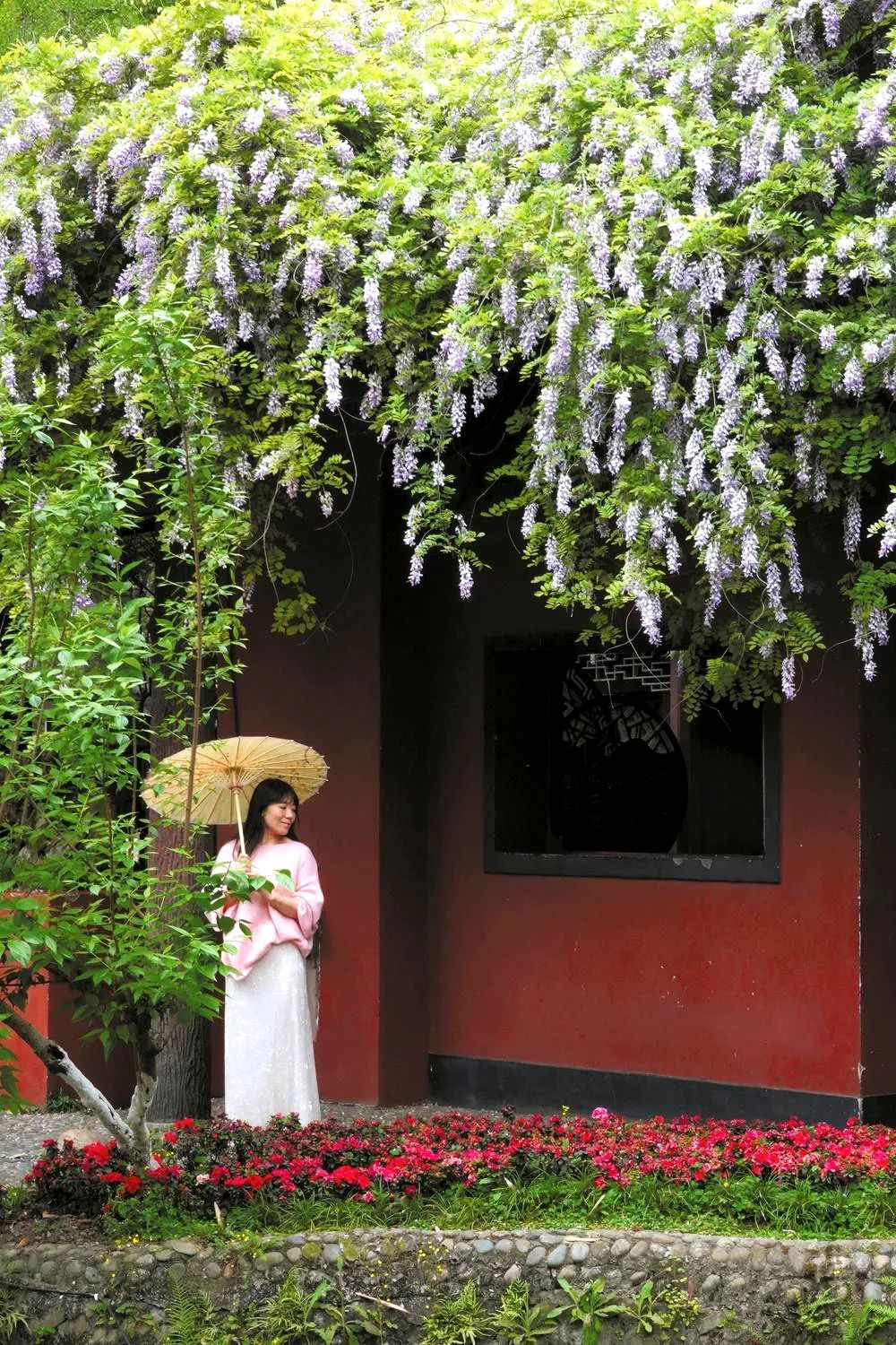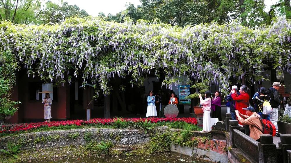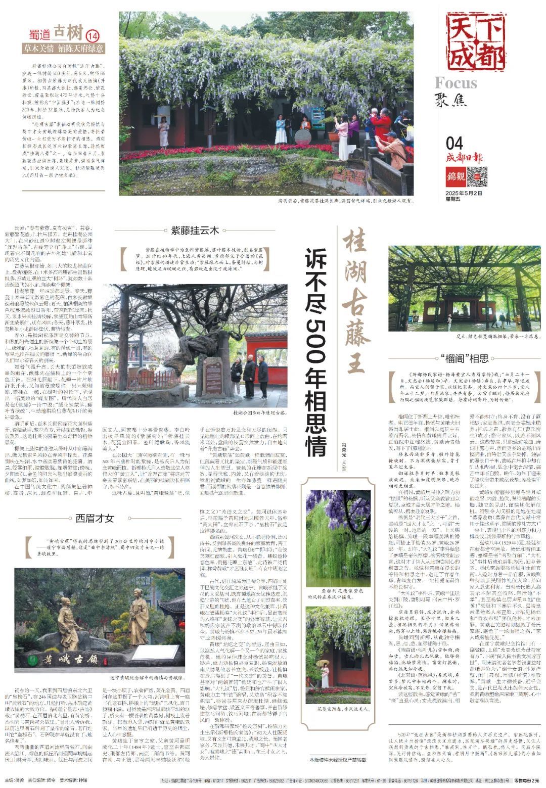 500年“连理古藤”是新都桂湖重要的人文历史遗产。紫藤花盛开,让人既生出杨慎“滚滚长江东逝水,浪花淘尽英雄”的历史感慨,又让人联想到黄峨的千古相思,“难离别,情万千。眠孤枕,愁人伴。闲庭小院深,关河传信远。鱼和雁天南,看明月中肠断”,《卷帘雁儿落》的小曲如同紫藤花瀑布,激荡在人心头。