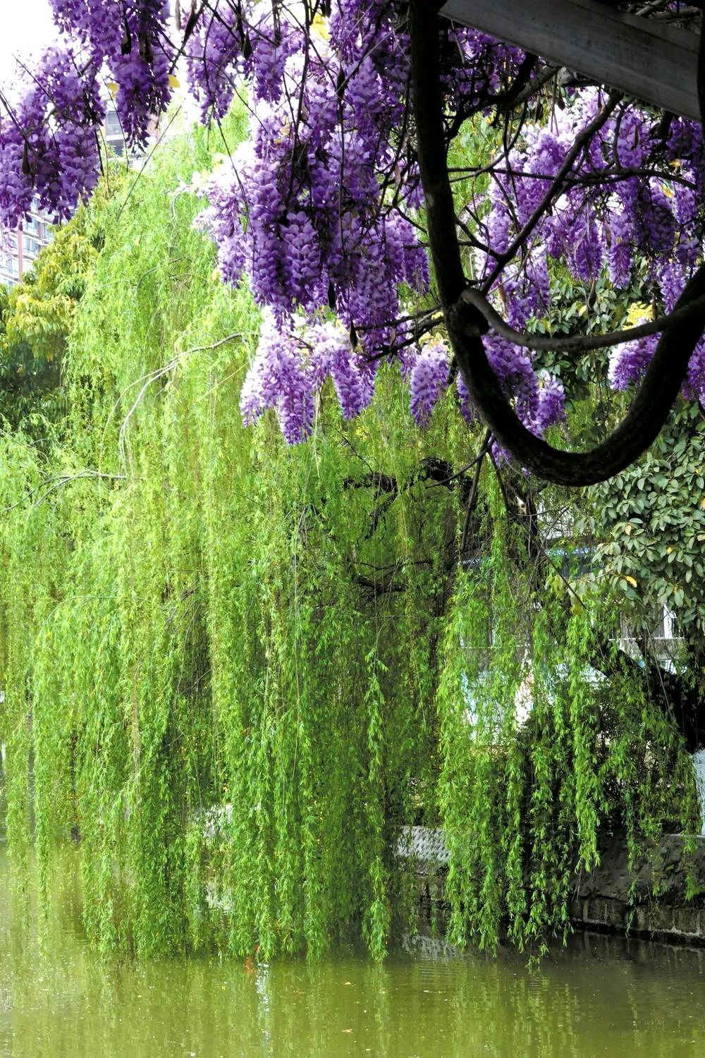 清明前后,百米长廊紫藤花大面积盛开,紫穗悬垂,紫花芬芳,开得蓬蓬勃勃、轰轰烈烈,这是桂湖公园最生动奇特的植物景观。