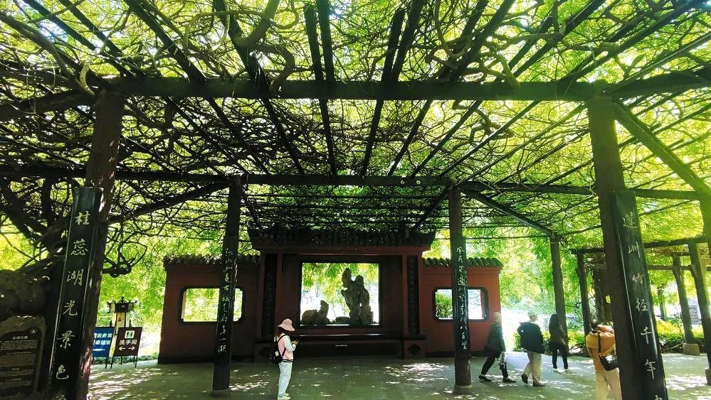 新都桂湖公园夏天,绿色枝蔓铺满棚架,带来一方凉意