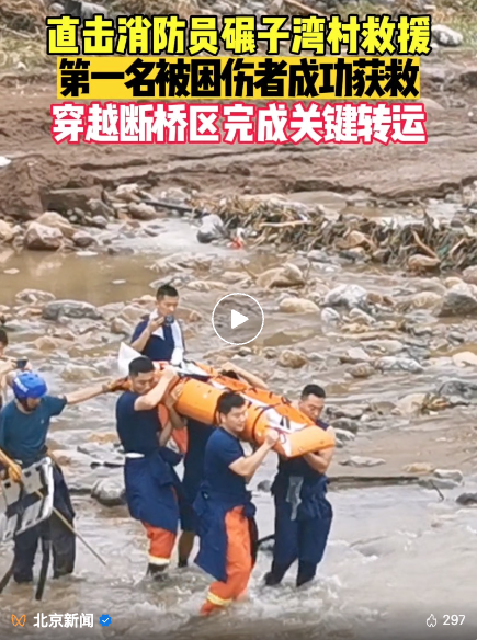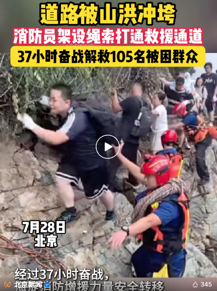 在怀柔区碾子湾村,因桥梁被冲断消防员徒步6公里涉水进村,利用树木和绳索架设临时通道,成功转移被困游客。“现在看到希望了!”被困游客在看到消防员的那一刻哽咽了……