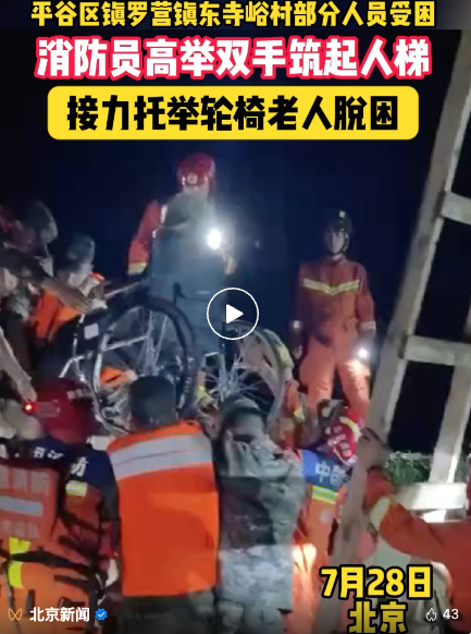 29日凌晨,在平谷区镇罗营镇,武警官兵搭建人梯接力托举,将轮椅老人安全转移,共救出190余名受困群众。