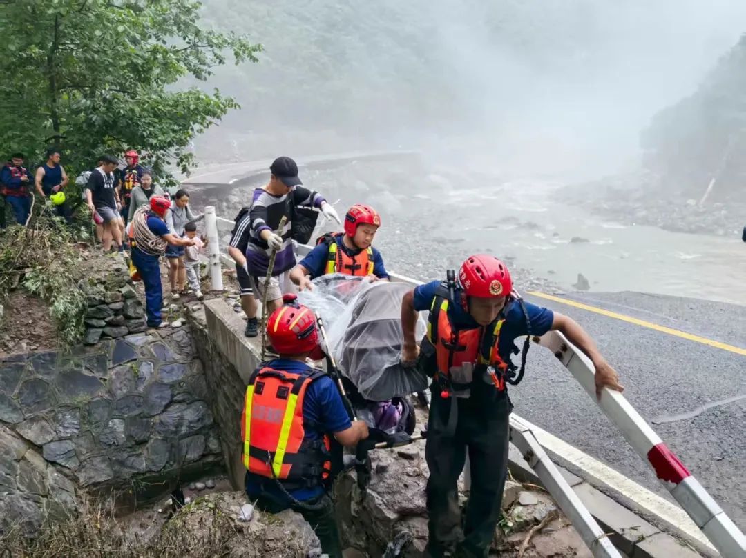 由于山洪冲毁道路,多处形成绝壁,救援人员架设绳索系统,背负行动不便的老人、儿童和伤者通过险段。经过37小时连续奋战,至28日中午12时,成功转移105名被困群众。其中,队员们或合力抬轮椅,或两人一组抬婴儿车,成功将包括4个月大婴儿在内的受困人员全部转移至安全地带。