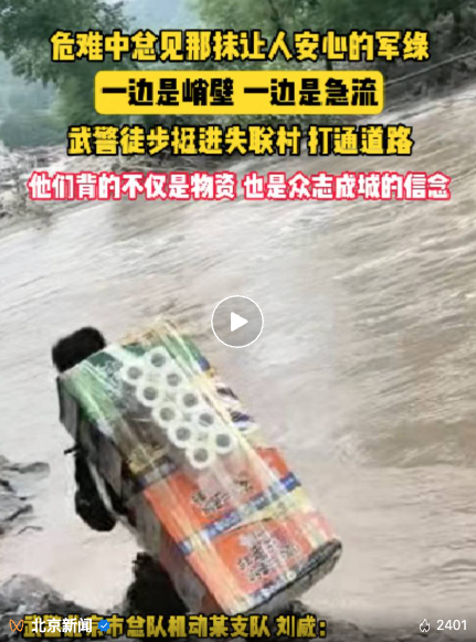 7月26日晚,武警北京总队机动某支队15名官兵接到任务,要挺进密云区断水断路断通信的冯家峪村。为了早点打通救援通道,官兵们徒步急行军13公里,翻越2座海拔200米的陡峭山峰,涉过3条湍急河流,为该地恢复卫星通信,并将80余箱生活物资送达冯家峪村灾区受困群众手中,成为首支抵达该灾区的救援部队。