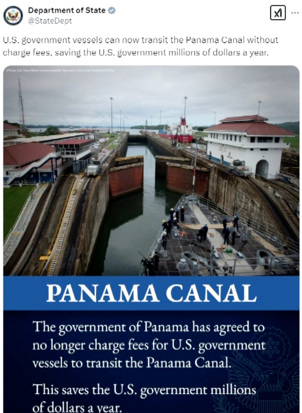 美国国务院5号在社交媒体上说,美国政府船只现在可以免费通过巴拿马运河,这将为美国政府每年节省数百万美元。同一天,巴拿马运河管理局发表声明,否认让美国政府船只免费通过巴拿马运河。