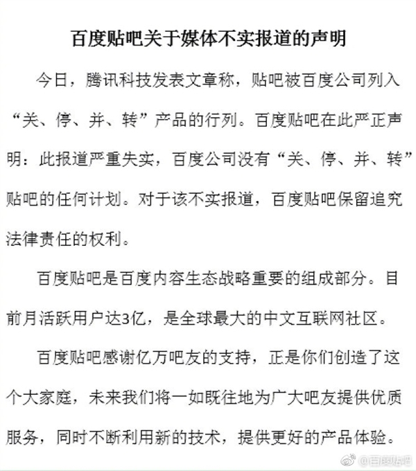 对此百度贴吧辟谣称,此报道严重失实,百度没有“关停”贴吧的任何计划,对于该不实报道,百度贴吧保留追究法律责任的权利。