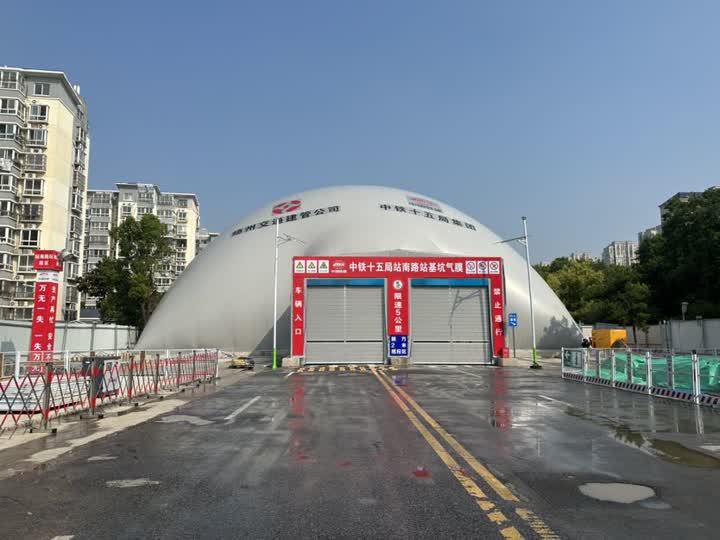 站南路站紧邻居民楼、学校和河道,周边环境复杂,基坑气膜投入使用后,能将施工过程与外部环境完全隔离,大幅降低扬尘扩散和噪声传播,最大程度减少对周边居民生活及城市环境的影响,同时,20米高度的精准设计,在满足施工需求的同时,完美避开了对周边建筑的日照遮挡,让文明施工有了具象化的温度表达。