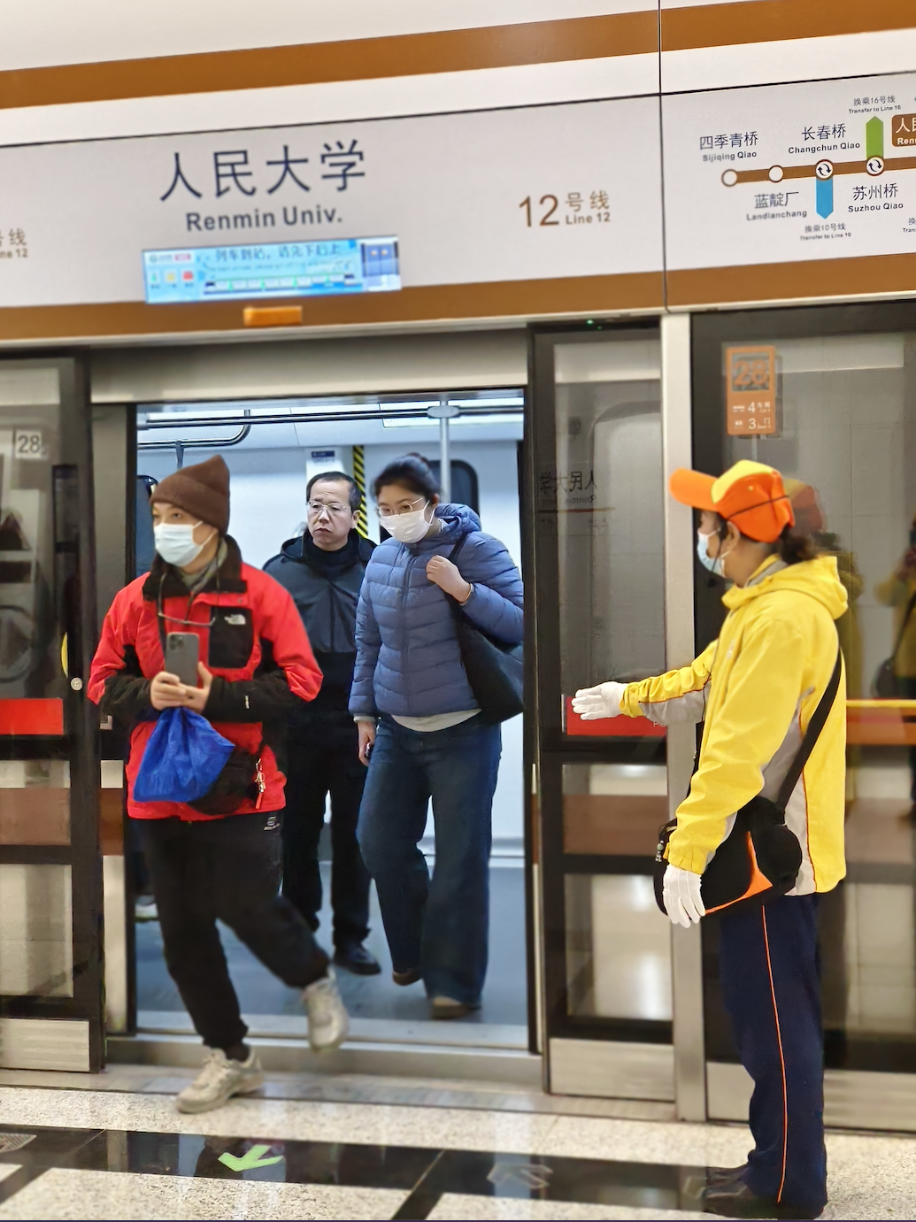 人民大学地铁站:文明引导员用温暖的笑容和专业的手势,引导乘客有序上下车,营造和谐的乘车环境。