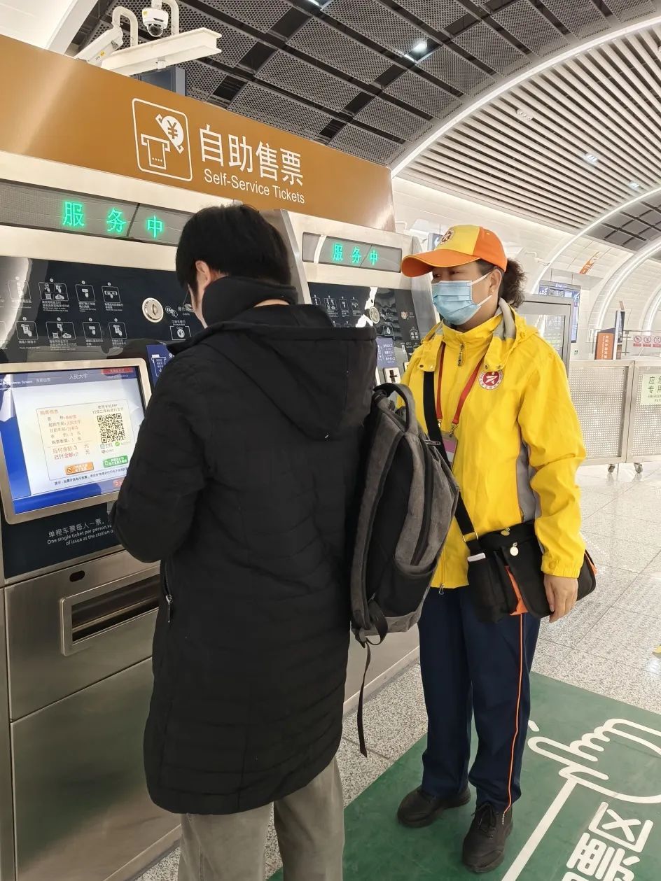 苏州桥地铁站:文明引导员化身为“购票小助手”,耐心协助乘客购票,解答乘车咨询。