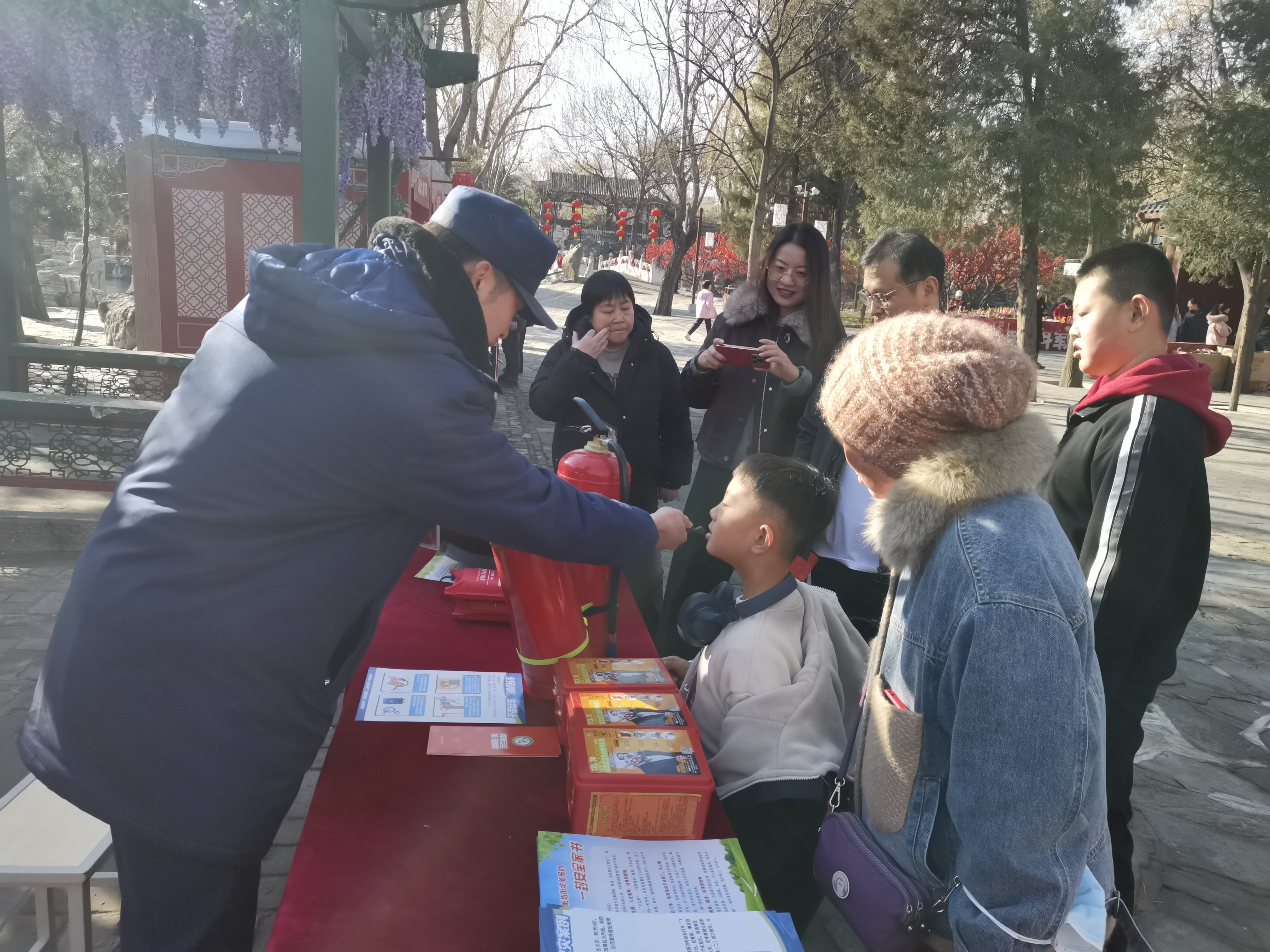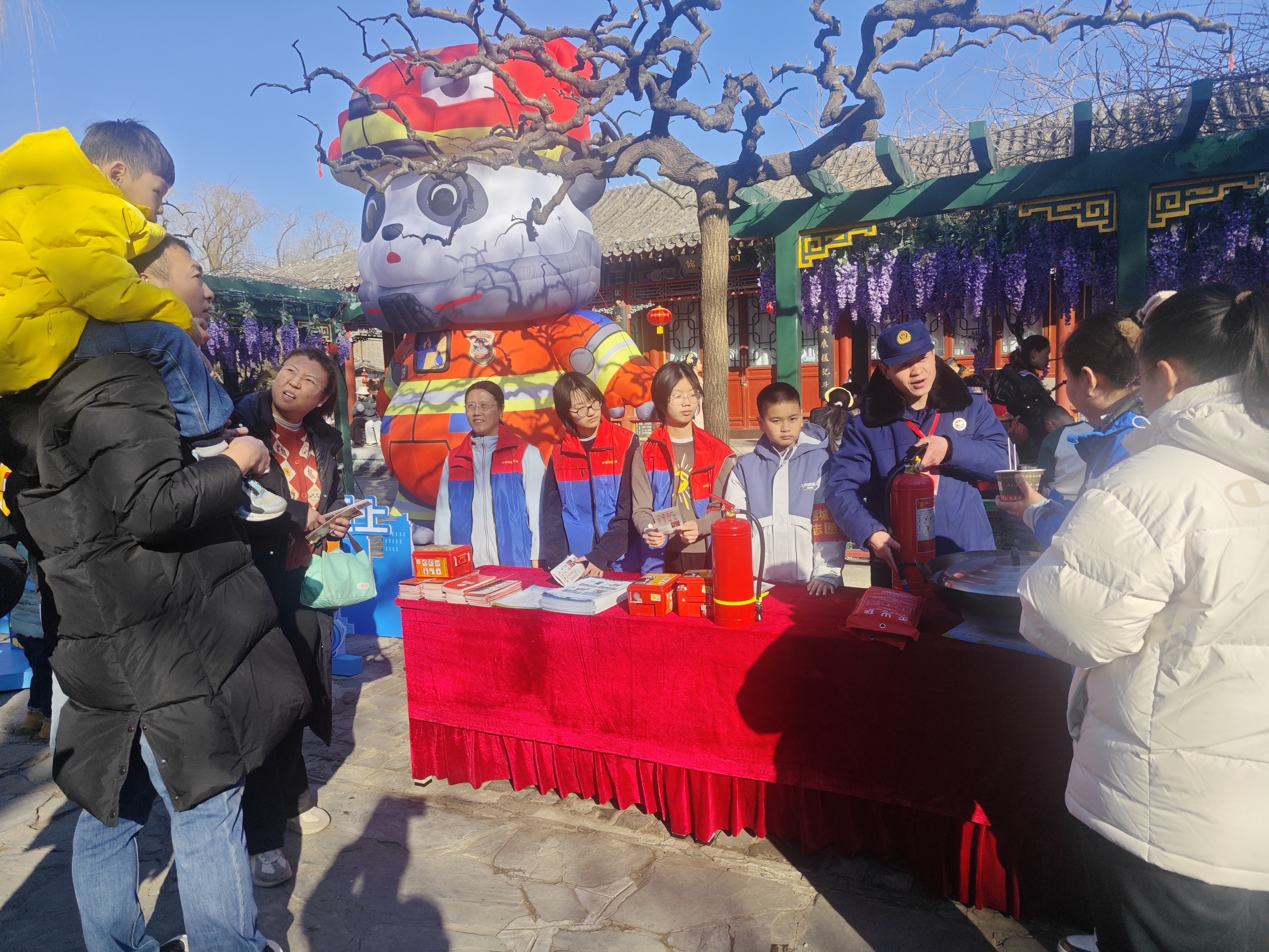 在大观园庙会,消防宣传点设在凹晶溪馆门前,配备多名消防人员为市民讲解消防知识,盖章打开。此外,现场设置了消防知识展板、模拟灭火器体验区,游客可以亲身参与“模拟灭火器灭火”“逃生面罩使用”等互动项目,学习实用的消防技能。