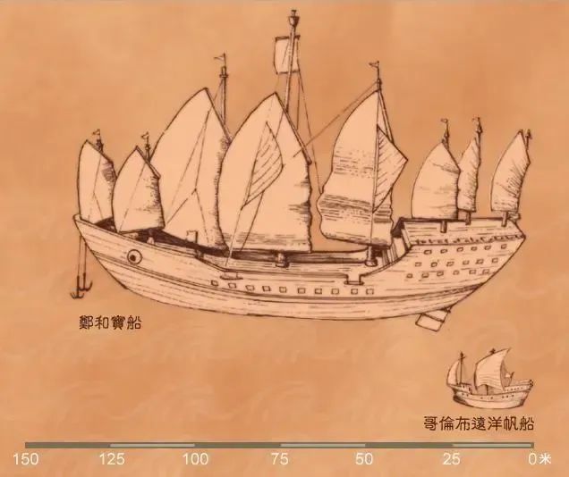 郑和宝船与哥伦布远洋帆船对比图,郑和宝船是当时世界上最大的海船。来源:搜狐新闻