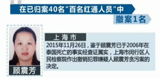 上海市顾震芳案,2015年11月26日,鉴于顾震芳已于2006年在泰国死亡的事实经查证属实,上海市闵行区人民检察院作出撤销犯罪嫌疑人顾震芳贪污案的决定。