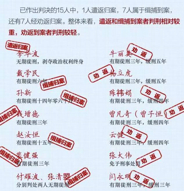 其中,江西省李华波案, 2015年5月9日李华波在新加坡被判处十五个月有期徒刑,服刑期满后被遣返回中国。 2017年1月23日,上饶市中级人民法院判处李华波无期徒刑,剥夺政治权利终身,追缴赃款人民币482.98万元、没收新币545.4158万元。