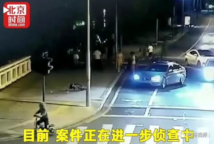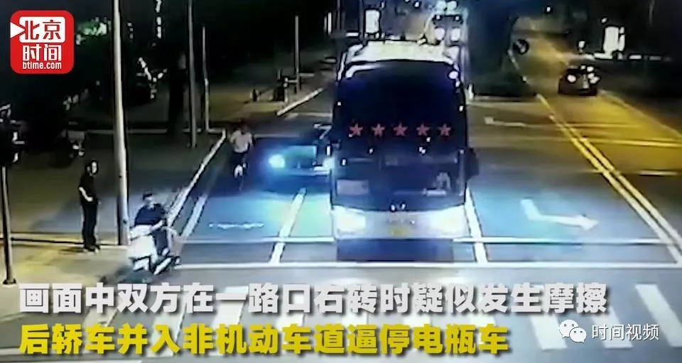 另一视角视频中,电动车主于某捡起刘某掉落的刀具,并用刀具将刘某致死倒地。画面中双方在一路口右转时疑似发生摩擦后轿车并入非机动车道逼停电瓶车。