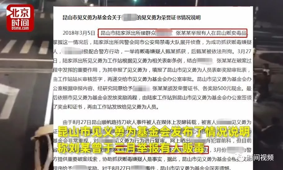 针对刘某龙今年3月份曾获见义勇为证书情况,颁发单位给出正式声明,称刘某曾于三月举报有人贩毒,并积极配合警方行动将贩毒嫌疑人抓获而获得证书与奖金500元。并解释称,目前江苏省及昆山市市基金会奖励条款中,都未明确规定犯罪前科人员不能申报见义勇为。