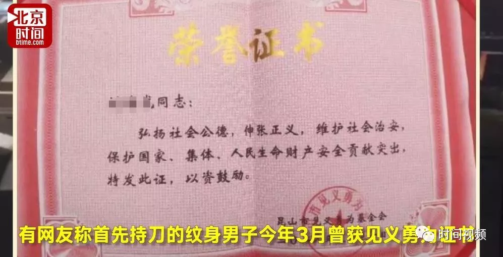 8月29日,有网友称江苏昆山刑案中首先持刀的纹身男子今年3月曾获见义勇为证书,引发网友质疑。昆山市见义勇为基金会发布说明,称刘某曾于三月举报有人贩毒,并积极配合警方行动将贩毒嫌疑人抓获,目前奖励条款中未明确规定有犯罪前科人员不能申报见义勇为。