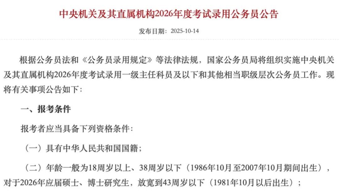根据中央机关及其直属机构2026年度考试录用公务员公告,公务员招录年龄上限由往年的35周岁调整为38周岁,对应届硕士、博士研究生,则放宽到43周岁以下。