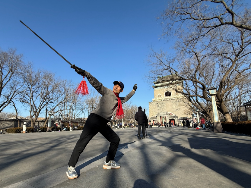 70岁的范来友手持长剑,一招一式间,是他与这片土地最亲密的对话。这位土生土长的东城人,对中轴线周边的变迁有着最直观的感受:“申遗之前,抬头看线,现在看不见空中乱糟糟,广场也扩宽了,生态越来越好。”
