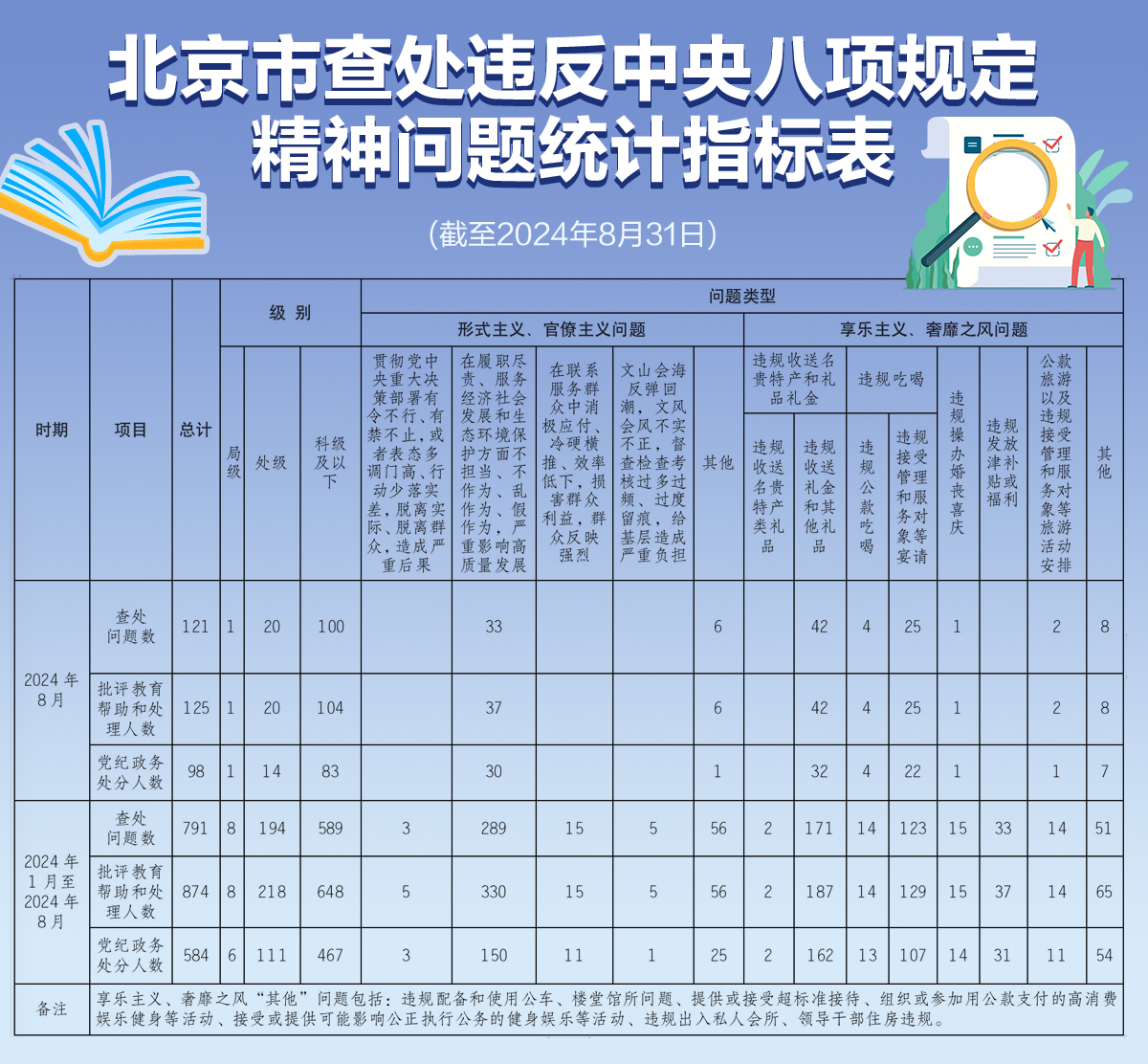 日前,北京市纪委监委公布今年1月至8月查处违反中央八项规定精神问题统计指标表。截至8月31日,全市累计查处违反中央八项规定精神问题791起,批评教育帮助和处理874人,其中局级8人、处级218人、科级及以下648人。
