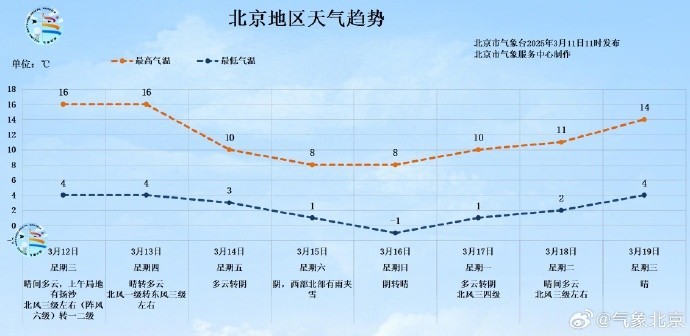 预计3月12日至19日,白天最高气温8~16℃,夜间最低气温 -1~4℃。