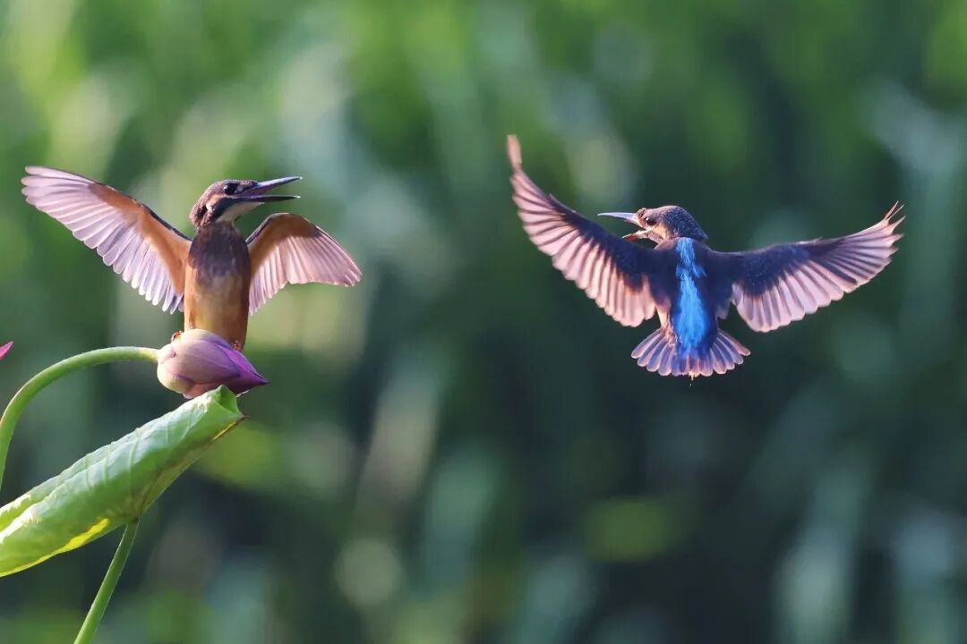 《双翠戏荷》以特写聚焦翠鸟互动,荷花的淡紫与羽毛的蓝棕形成柔色层次,振翅的动态让静态场景瞬间鲜活,既展现了生灵的灵动,又使自然微观的美感精准呈现。