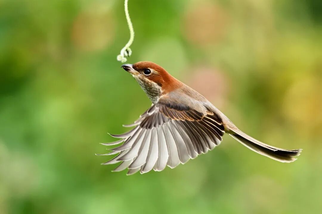 《牛头伯劳》借助高速连拍捕捉捕食瞬间,虚化的绿色背景衬托出伯劳的羽色层次,翅膀的舒展线条与蛛丝的纤细形成细腻对比,既展现了生灵的灵动,更显对微观场景的敏锐观察。