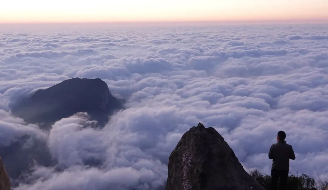 《观云海》以远景展现霞云岭乡的奇观,人物的渺小身影与隐现的山峦构建出空间层次,晨雾的柔白与天色的淡紫晕染出空灵意境,这种对“人入自然”尺度的精准把控,使景观的壮阔与个体的诗意达成平衡。