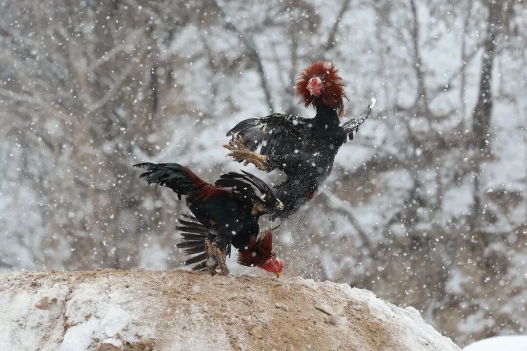 《雪中斗鸡》通过特写构图聚焦对峙瞬间,雪花的冷白与羽毛的黑红形成强烈对比,快门的精准定格让翅膀的振颤、雪粒的飞溅清晰可触,既凸显了生灵的野性,又使寒冬的冷冽与生命的热烈形成绝妙反差。