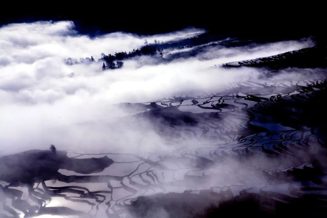 《梯田云海》以低饱和度的冷调营造出元阳的独特意境,雾气如轻纱般晕染在梯田的曲线之间,黑白灰的层次感弱化了色彩的繁杂,凸显出梯田如大地指纹般的线条韵律;晨雾未散的拍摄时机,巧妙地将云雾的虚实与梯田的肌理形成鲜明对比。