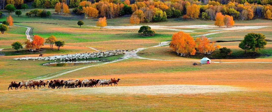 《金秋牧歌》以高视角展现坝上秋日肌理,暖调的光线温柔地包裹着黄绿交织的草原,金黄的白桦树宛如散落的星火,羊群、驼队与蒙古包共同构成了一幅层次分明的生活画卷。