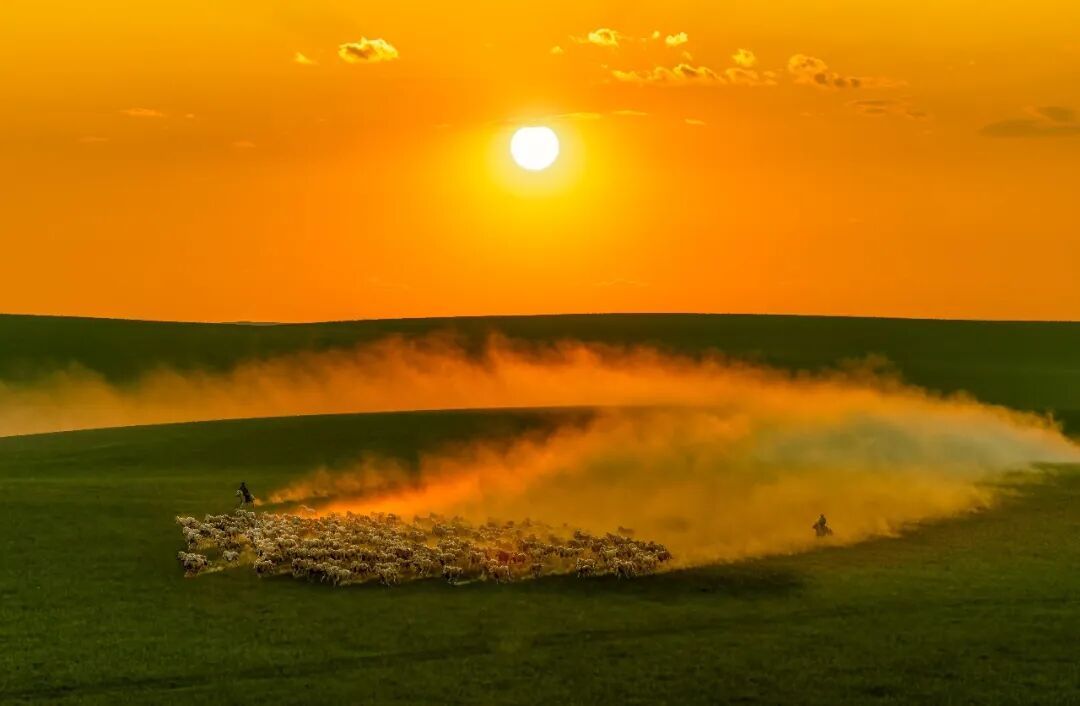 《骏马奔腾》采用低角度跟拍,锁定草原暮色,夕阳的暖橙光线环绕奔马与羊群,扬起的尘雾宛如金色绸带,既凸显了草原的辽阔质感,又使“牧归”的动态瞬间充满张力。