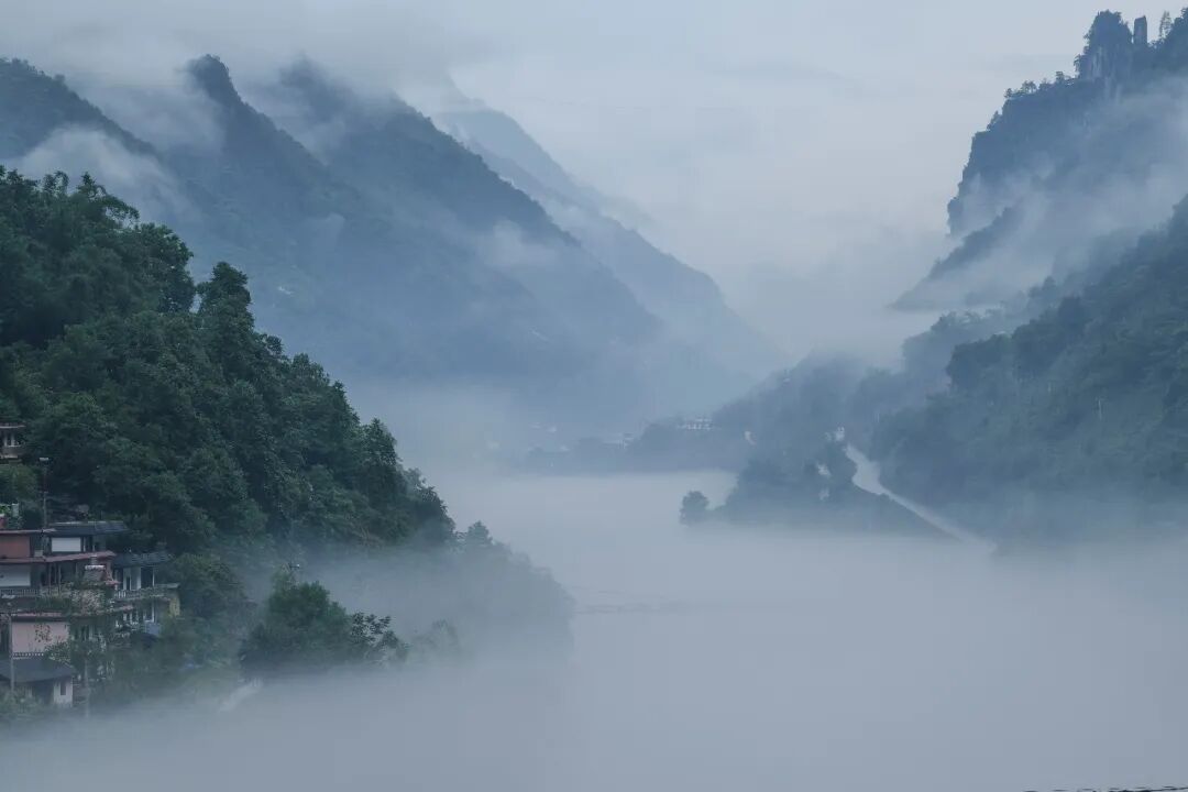 《水墨怒江》以柔雾为笔,山峦的深绿与雾气的浅灰晕染成水墨质感,隐现的村落与公路为秘境增添生活温度,这种对雾气氛围的捕捉,使地貌的壮阔添了空灵之美。
