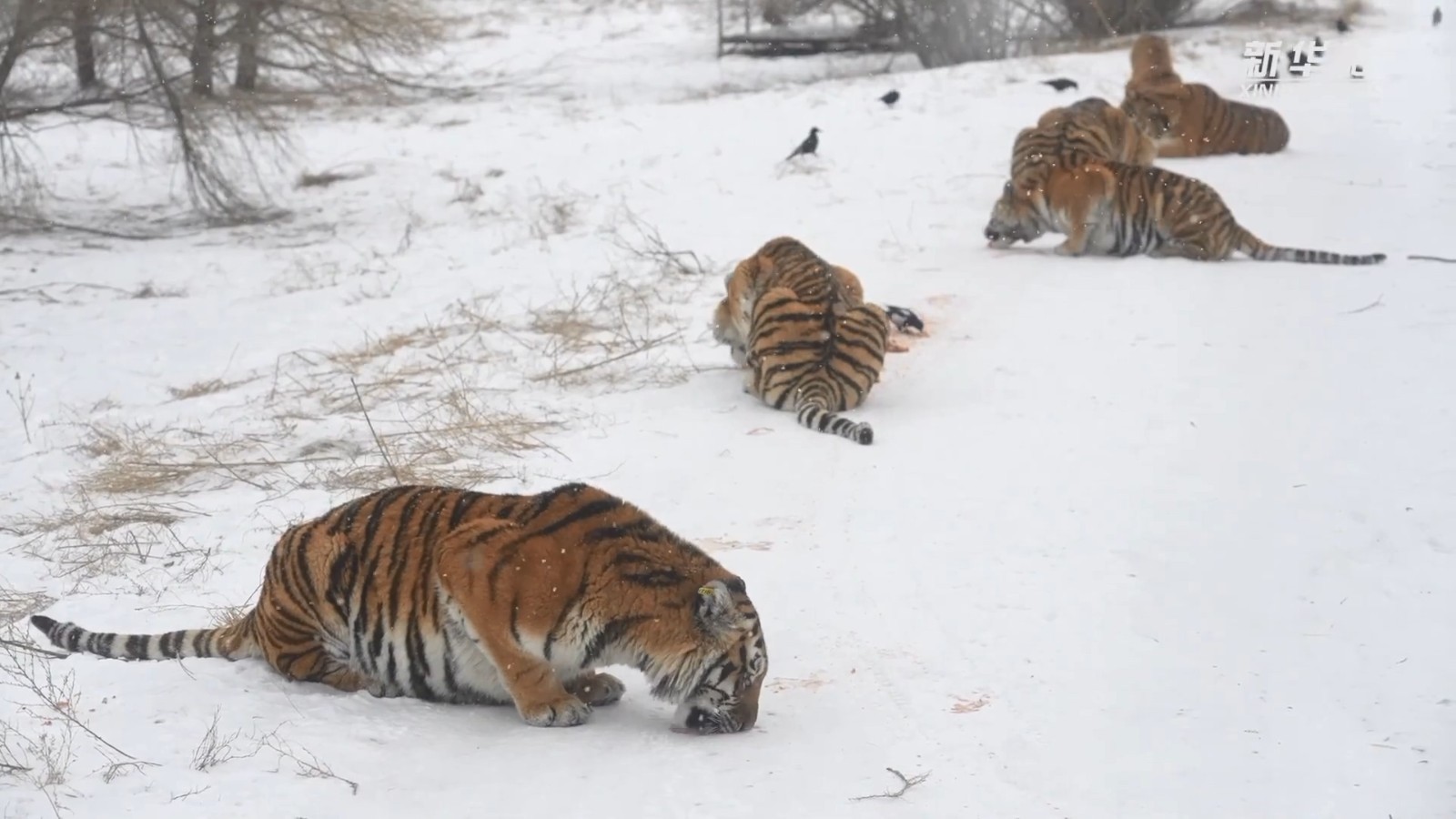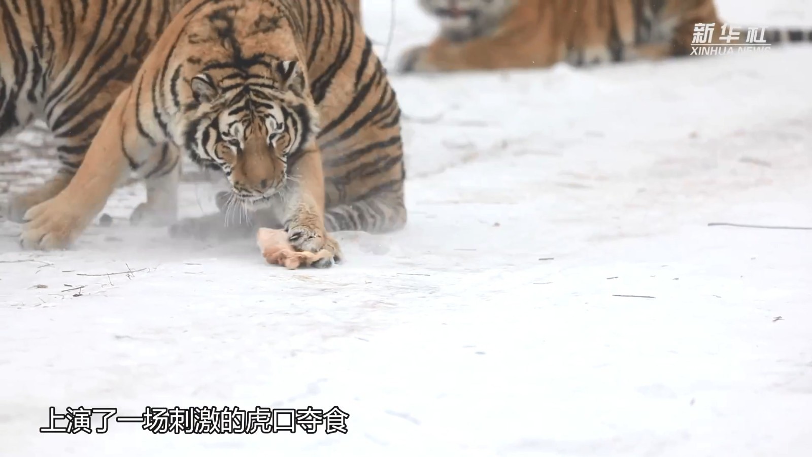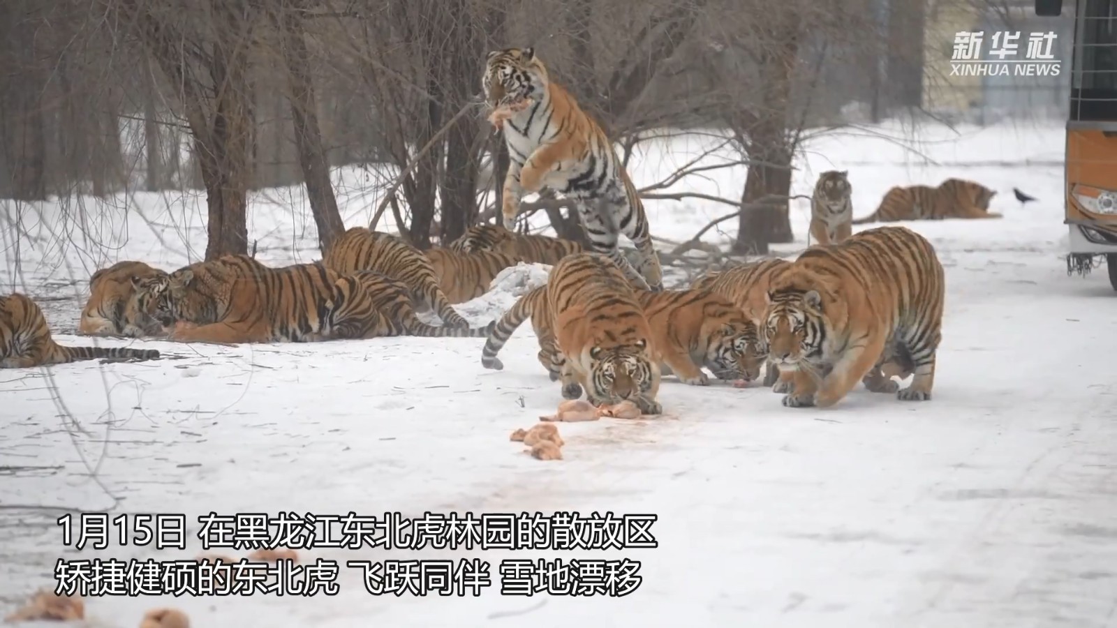 1月15日,黑龙江东北虎林园的散放区,一群矫捷健硕的东北虎争夺地上的肉块,上演了一场飞跃同伴、雪地漂移的“虎口夺食”大戏。网友:这大橘猫站起来原来这么高!
