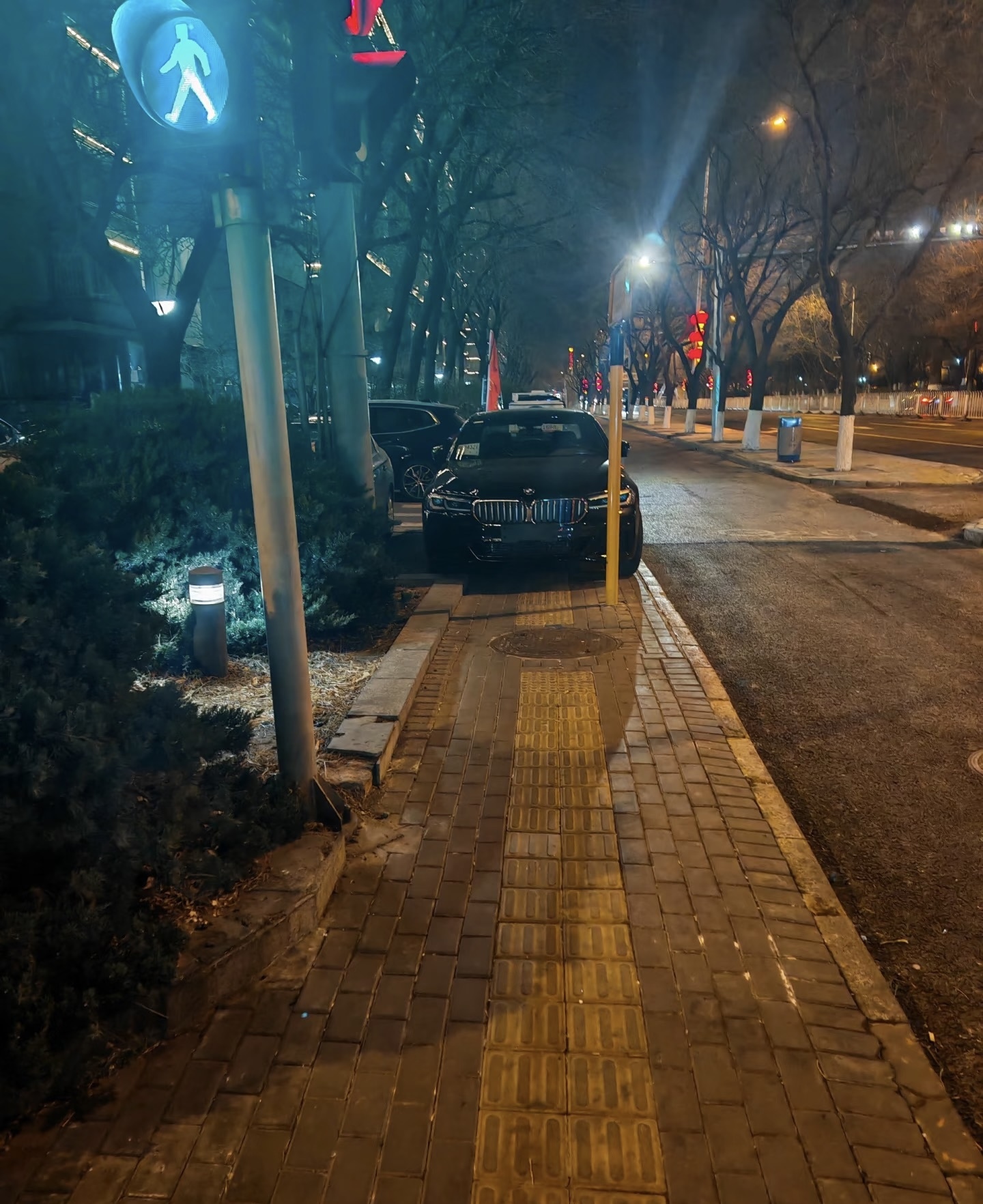 一辆贴着临牌的车违停在人行道上,影响行人通行。
