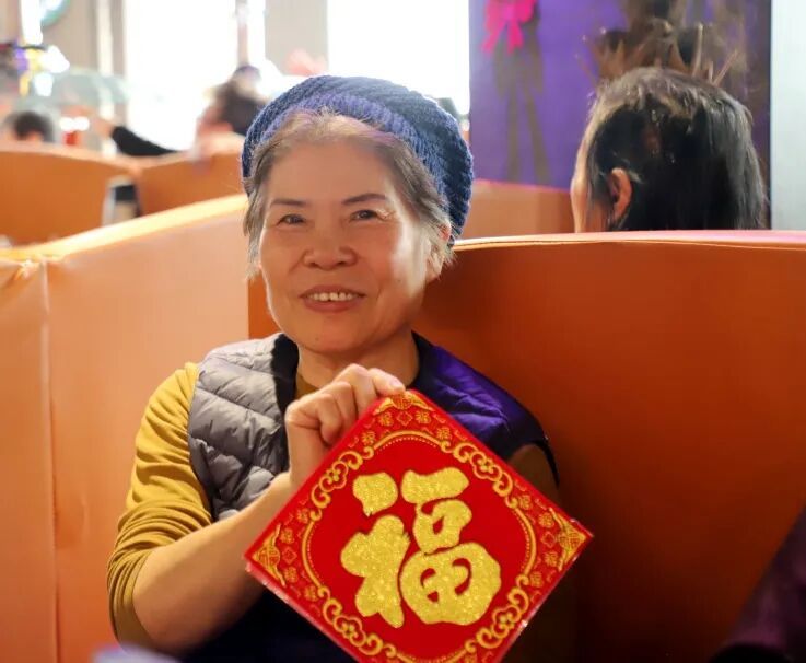 从工作人员手中接过福字礼品,笑容满面