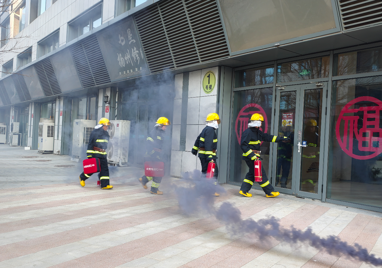 随即,利用高喷消防车和云梯消防车从建筑外部高空喷射灭火剂,控制火势向上蔓延,同时为内攻组提供掩护。消防灭火机器人同步赶到现场,由消防员遥控对建筑物外立面火灾进行压制。供水组迅速占领地下消火栓进行不间断供水,同时设置打开送风排烟系统,迅速改善内部救援环境,减少烟热聚集。随机总指挥下达总攻命令,所有作战小组立即进行总攻,对火势发起全面扑救。