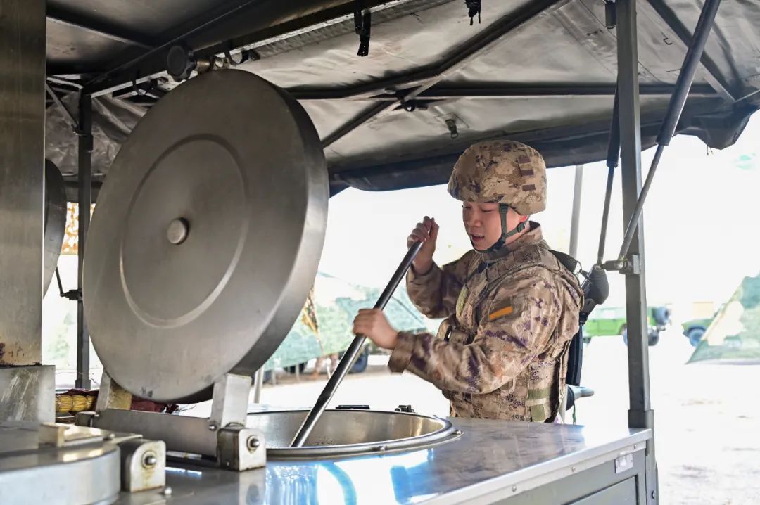 野外炊事区,炊事小组接到命令后,明确分工,迅速展开行动。他们在规定时间内完成菜品制作,并送达一线。