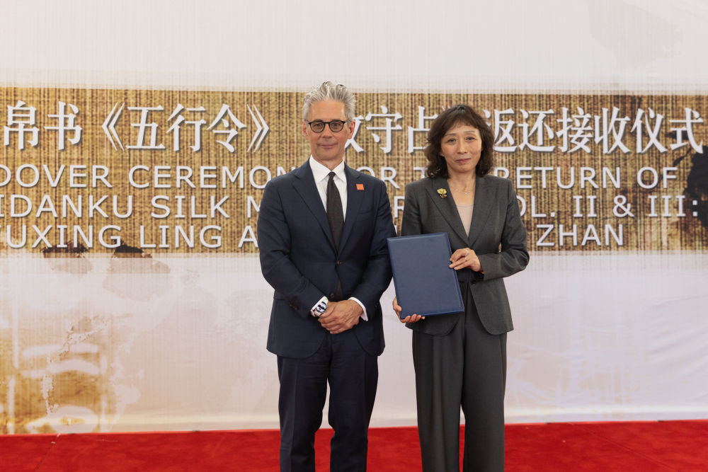 当地时间5月16日,国家文物局在中国驻美国大使馆接收美国史密森学会国立亚洲艺术博物馆返还的子弹库帛书《五行令》《攻守占》,它们将于今年7月在中国国家博物馆举办的“万里同归——新时代文物追索返还成果展”上首次面向公众展出。