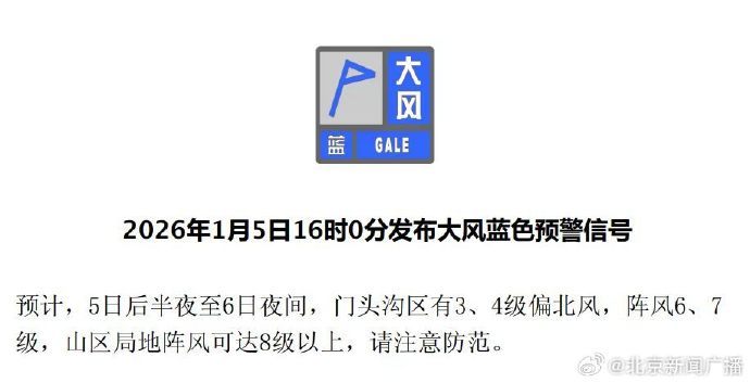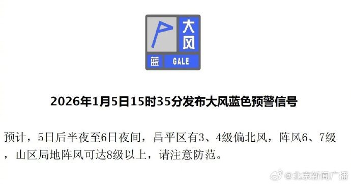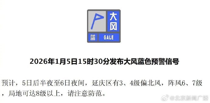 北京门头沟区、延庆区、昌平区气象台发布大风蓝色预警信号,请注意防范。