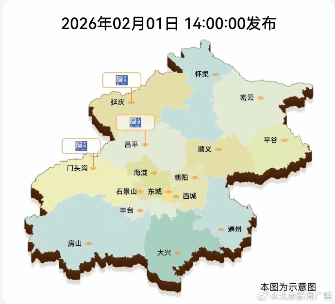 记者从北京市气象台了解到,门头沟区2月1日11时20分发布大风蓝色预警信号。预计,当前至今天夜间,门头沟区有3、4级偏北风,阵风6、7级,山区局地阵风可达8级以上,请注意防范。 延庆区、昌平区气象台也发布了大风蓝色预警信号。 另外,北京市气象台今天下午两点发布的预报显示,今天下午晴转多云,高海拔山区有零星小雪,偏北风三级左右,阵风六级左右,最高气温8℃;夜间多云转晴,偏北风二三间四级,最低气温-6℃。今天下午北风增大,西部阵风更明显,户外注意防风。空气干燥,注意用火用电安全。(@北京新闻广播 记者 张冰冰)