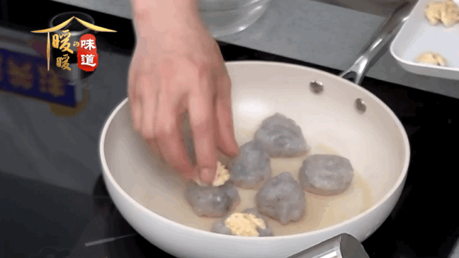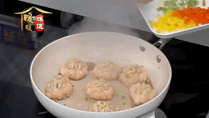 2、整形:准备一个小碗,倒入1份酱油3份水,锅中倒一点儿底油润锅开小火,手心沾水将虾滑挤成丸子下锅,然后将核桃仁往虾球上轻轻一摁。