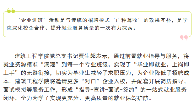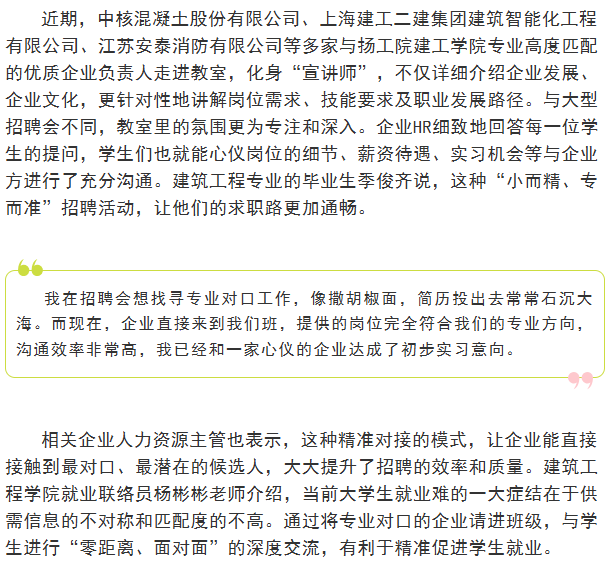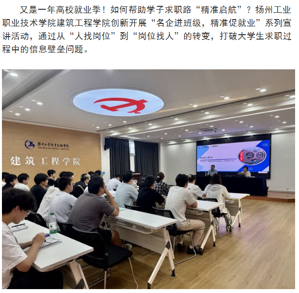 又是一年高校就业季!如何帮助学子求职路“精准启航”?扬州工业职业技术学院建筑工程学院创新开展“名企进班级,精准促就业”系列宣讲活动,通过从“人找岗位”到“岗位找人”的转变,打破大学生求职过程中的信息壁垒问题。