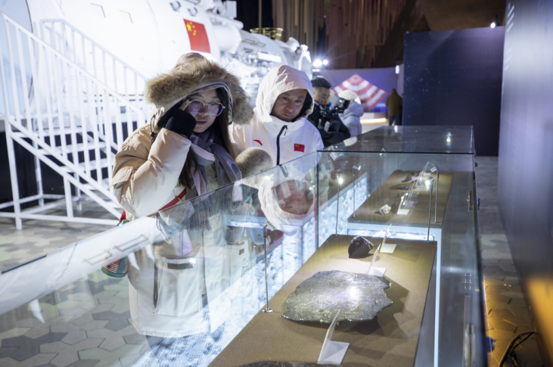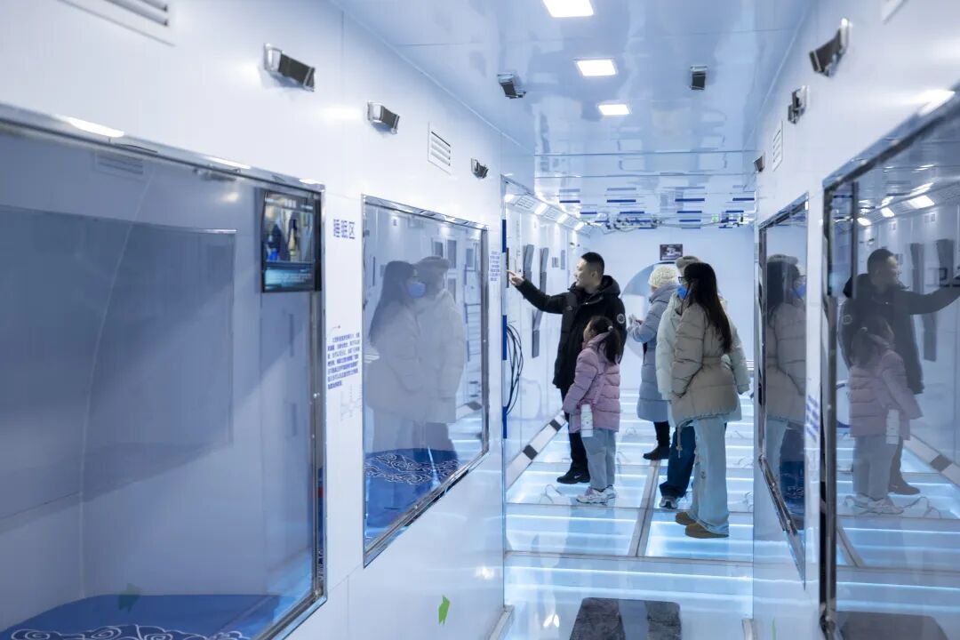 本届花灯艺术节不仅有神话“天宫”,科技“天宫”同时亮相。世园特别联合深空探测实验室北京公司推出“致敬中国航天主题特展”。步入展区,“天宫空间站核心舱”模型让人目不转睛,核心舱模型通体白色,总长约16米,重量超过10吨,包含大柱段、小柱段、节点舱及舱外机械臂等精密部件,游客还有机会亲身进入舱内,沉浸式体验这座“太空之家”。此外,特展中还特别展示了10余颗外太空陨石并特别安排了航天院士、专家与公众面对面交流环节,他们将分享中国航天事业的辉煌历程与前沿科技。