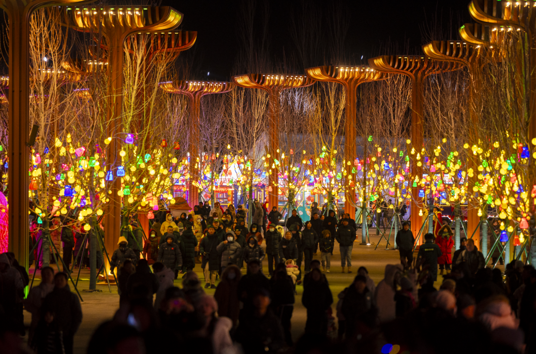 花灯艺术节期间,世园园区内部处处可见“天宫”痕迹。在中国馆东厅,“国潮风”主题市集引入《大闹天宫》联名文创、地方美食、甜品、非遗展示等,并设置区域复原动画中的场景,供游客拍照打卡。“天宫盛会”主题巡游在园区内同步举行,NPC变装中国传统神话造型,游客可与NPC同框打卡、互动。中国馆和植物馆两个点位特别引入了混合现实技术,游客佩戴专属眼镜,可以打通现实与虚拟时空,看到动画中的情节在身边上演。“我们把‘天宫灯会’主题当作冬季旅游的一次探索。花灯只是一个媒介,我们还尝试通过多种方式,让传统文化真实地走到大众身边。”北京世园投资发展有限责任公司党委副书记、副董事长、总经理贺兴华说。