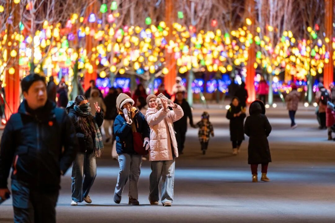 值得一提的是,本次北京世园国际旅游度假区与龙庆峡景区实现梦幻联动。世园花灯、龙庆峡冰灯均以《大闹天宫》故事为蓝本,在情节上,世园花灯深耕“蟠桃园至灵霄殿”天庭叙事线,龙庆峡冰灯则聚焦“龙宫借宝”水下剧情,形成故事线上的呼应串联。在世园园区内,花灯龙宫华光璀璨,引人注目,在龙庆峡冰灯艺术节现场,高大的冰灯龙宫晶莹剔透,气势恢宏。两座龙宫前还安装了互动屏幕,世园花灯龙宫与龙庆峡冰灯龙宫屏幕能够实时连线,游客可隔空同框互动,打造双灯会特色联动场景。