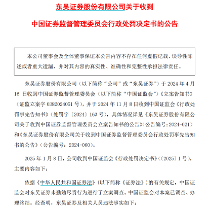 1月8日晚间,东吴证券发布公告称,其于当日收到证监会《行政处罚决定书》(〔2025〕1号)。因在国美通讯、紫鑫药业两个非公开发行股票项目中未勤勉尽责,相关文件存在虚假记载,东吴证券被证监会开出罚单,相关项目的保荐代表人也被一同追责。