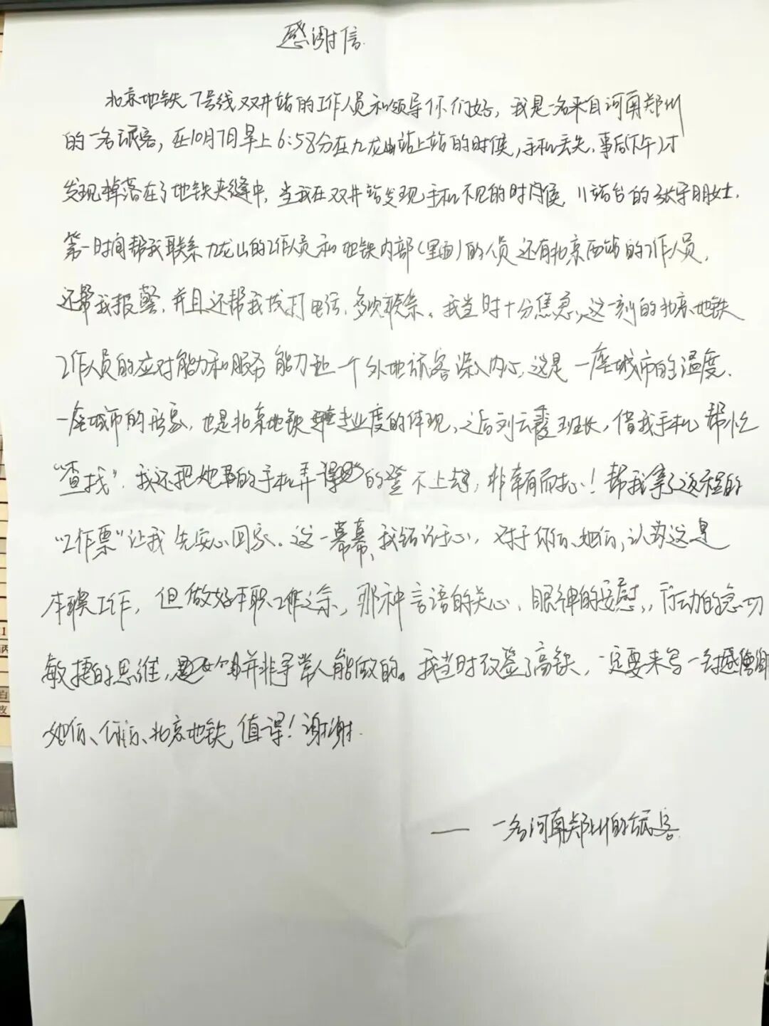 10月8日下午,一封感谢信送到了北京地铁7号线双井站。写信的外地男乘客,用文字记录下前一天自己手机丢失后,地铁工作人员全力协助找回的全过程,字里行间满是感激。