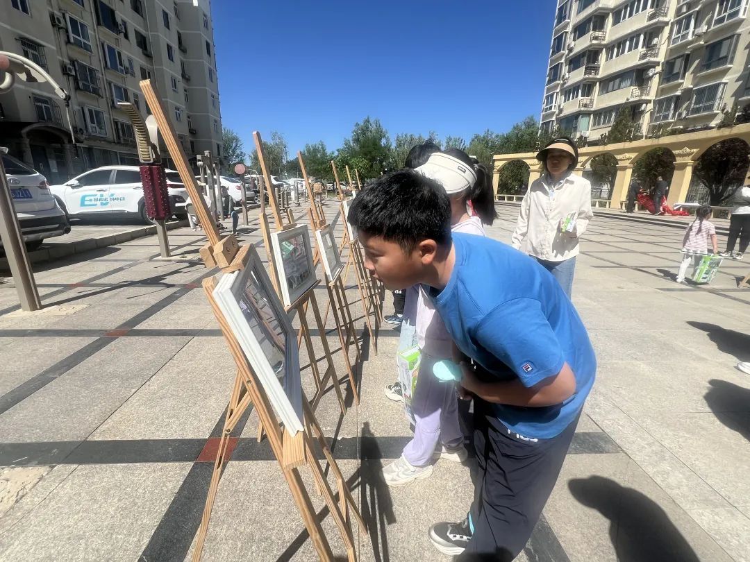 爱护地球、拥抱蓝天、践行垃圾分类……来自辖区的20余名青少年“垃圾分类我先行”环保创意主题绘画作品在小区广场内进行展示。