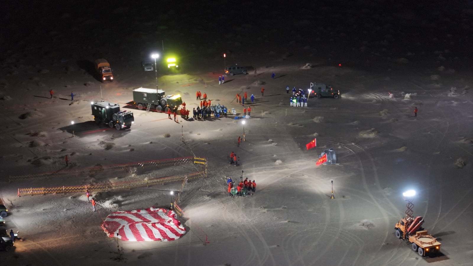 中心蔡超超说:“这次是着陆场第三次在夜间执行航天员搜救任务,针对这次夜间搜救的特点,我们加强了夜间搜索现场处置通信保障等训练,着重强化了照明保障。着陆现场,我们设置3套便携式照明灯,地面车辆到达后会架设两套广场灯,在直升机降落后,还将升起3架照明无人机,这样现场会形成一个立体的照明效果,为航天员点亮归航之路。”