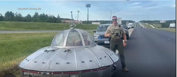 美国密苏里州克劳福德县警长办公室表示,警员们在该县州际公路上拦下了一辆飞碟形状的机动车。这辆车本来要前往新墨西哥州罗斯威尔市参加活动。