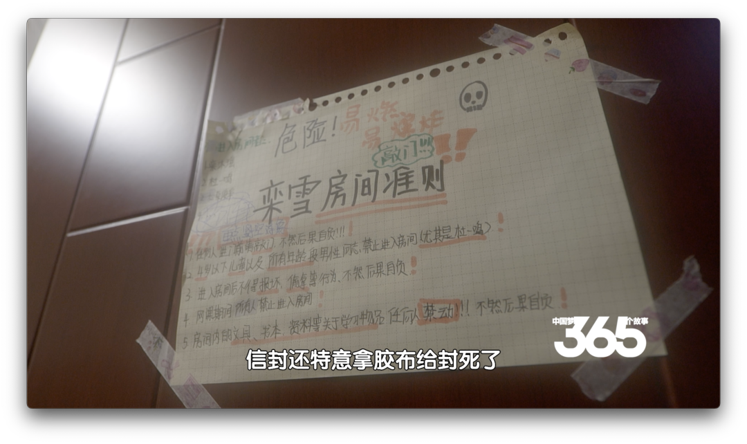 我们在泰安的两天时间里,栾雪大部分时间都待在自己房间里,门上贴着纸条:“任何人进门前都要敲门,不然后果自负。”我让薛巧艳转达栾雪,我想跟她聊聊,可以不聊她的爸爸。没想到孩子居然同意了。我们从她的学习聊起,聊着聊着,孩子居然主动说起了爸爸。她说:“我允许自己的一些情绪发生,不会因为一些眼前的问题,把自己困在这里很久走不出来。别人都在往前,没有时间给你消化这些东西,先让自己不去想这些,然后先把眼前的事完成再说。”我说你妈妈有时候有一些担心你,怕你走不出来。她说:“我妈确实是这一年压力要比我大得多。我要做的就是把自己管好,不要让她再操心我。她现在要撑起一个家,有老人有小孩,还要撑起店里,其实她很脆弱的,她现在是在强迫自己坚强起来。但其实我不想让她这样。她首先应该是她自己,然后再是我们的妈妈。我有时候也会和她说,你不要给自己那么多压力,你也需要放松。我最大的愿望应该就是希望她能过得好吧。”说完这句她又补充了一句:“我最大的希望就是希望他俩能过得好。她往后也能幸福一点,让自己不要过得那么累。”我明白栾雪口中的“他俩”指的是谁。听到这句,我再也绷不住了,我说:“孩子,请允许阿姨抱你一下。”采访全程,这个孩子都没有掉一滴泪,而镜头外的我和摄影师早已泪流满面。孩子的坚强和懂事让我们震撼,她和妈妈都在彼此为对方考虑,但其实又都比对方想象得更加坚强。我问她:“你跟我讲的这些有和妈妈说过吗?”她摇摇头。